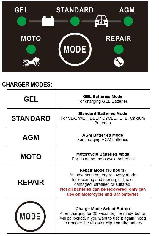 - มีโหมดการชาร์จที่หลากหลาย ได้แก่ GEL, STANDARD, AGM, MOTO และ REPAIR (ซ่อมแบตเตอรี่)